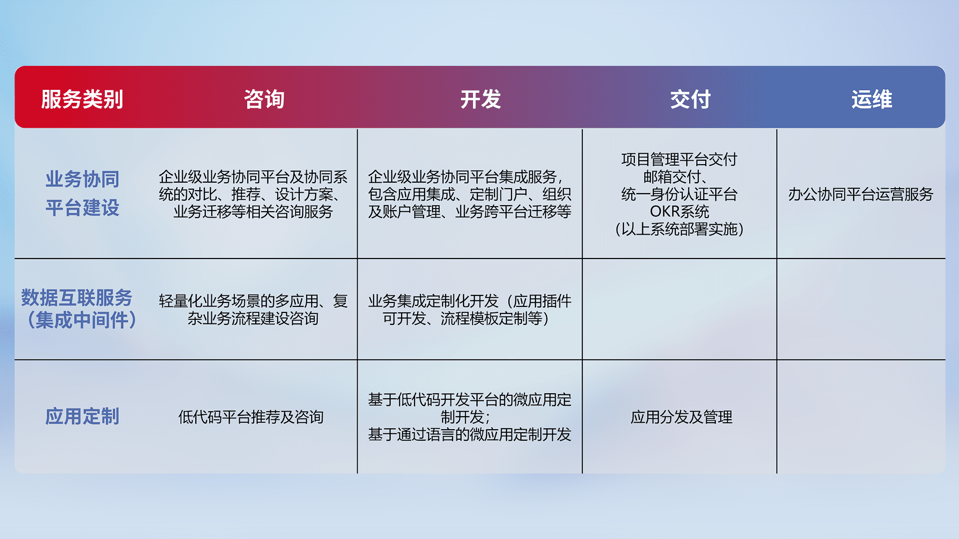 针对钉钉、、、企微、、、IDaas等平台级产品提供产品的规划、、方案、、、交付、、、、定制化开发等服务,,,,实现如统一协同办公、、、、智能客户服务、、、混合会议管理、、智能数据查询、、等业务场景,,,实现数字化转型。。。。