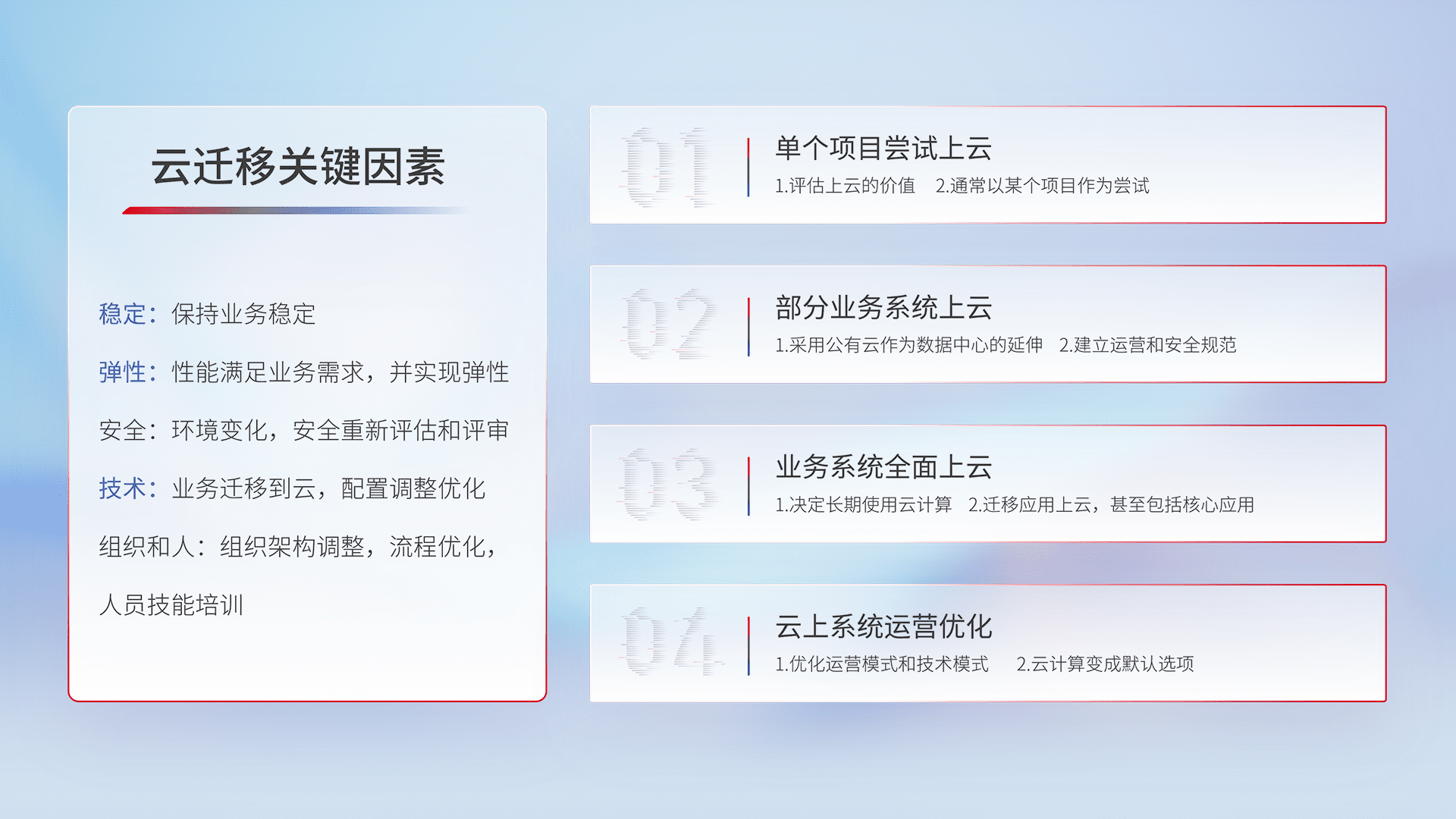 结合实际业务,,,,从规划设计、、、、云平台选型、、、、云原生改造、、数据迁移、、、、集成交付,,,,迁移全过程为客户识别最佳上云路径,,,做好风险识别管理,,设计网络架构、、身份权限、、、安全审计合规、、、操作审计、、日志审计、、、、监控告警策略、、多站点容灾设计等,,,,对云上基础设施进行整体规划,,,,提升IT治理水平,,以满足弹性、、、高可用、、高性能的需求。。