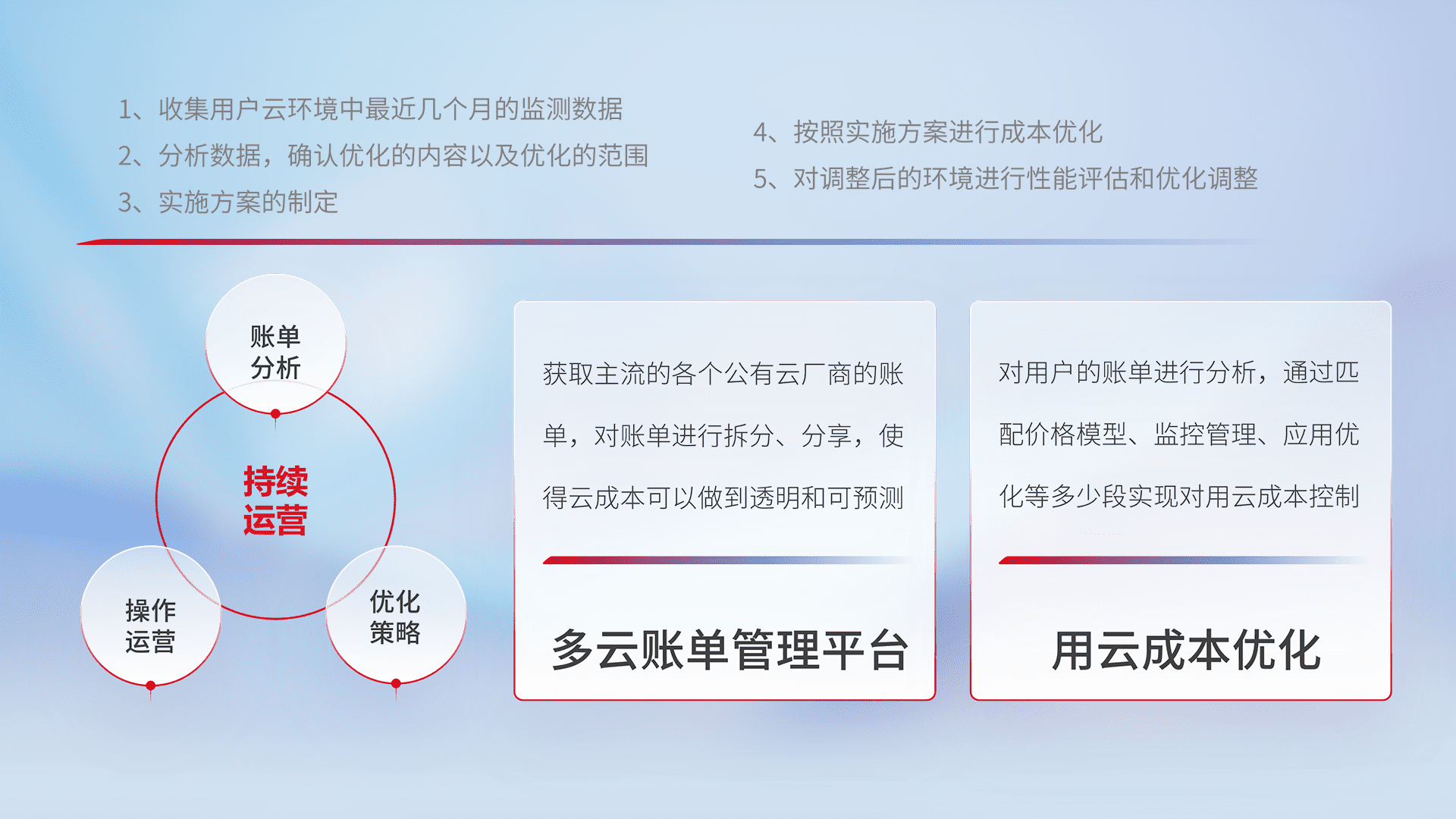 通过多云纳管,,以统一的资源数据模型把客户的云资源进行抽象和封装,,进而实现对多云资源的统一操作,,,保障云资源管理的可靠性、、、稳定性与可用性。。量身定制化运维内容,,配置、、、、开发运维、、补丁管理、、、、备份、、、监控、、、认证和访问管理、、审计和日常巡检等,,,,保障在用云过程中的可靠度,,稳定度以及高可用率。。。。